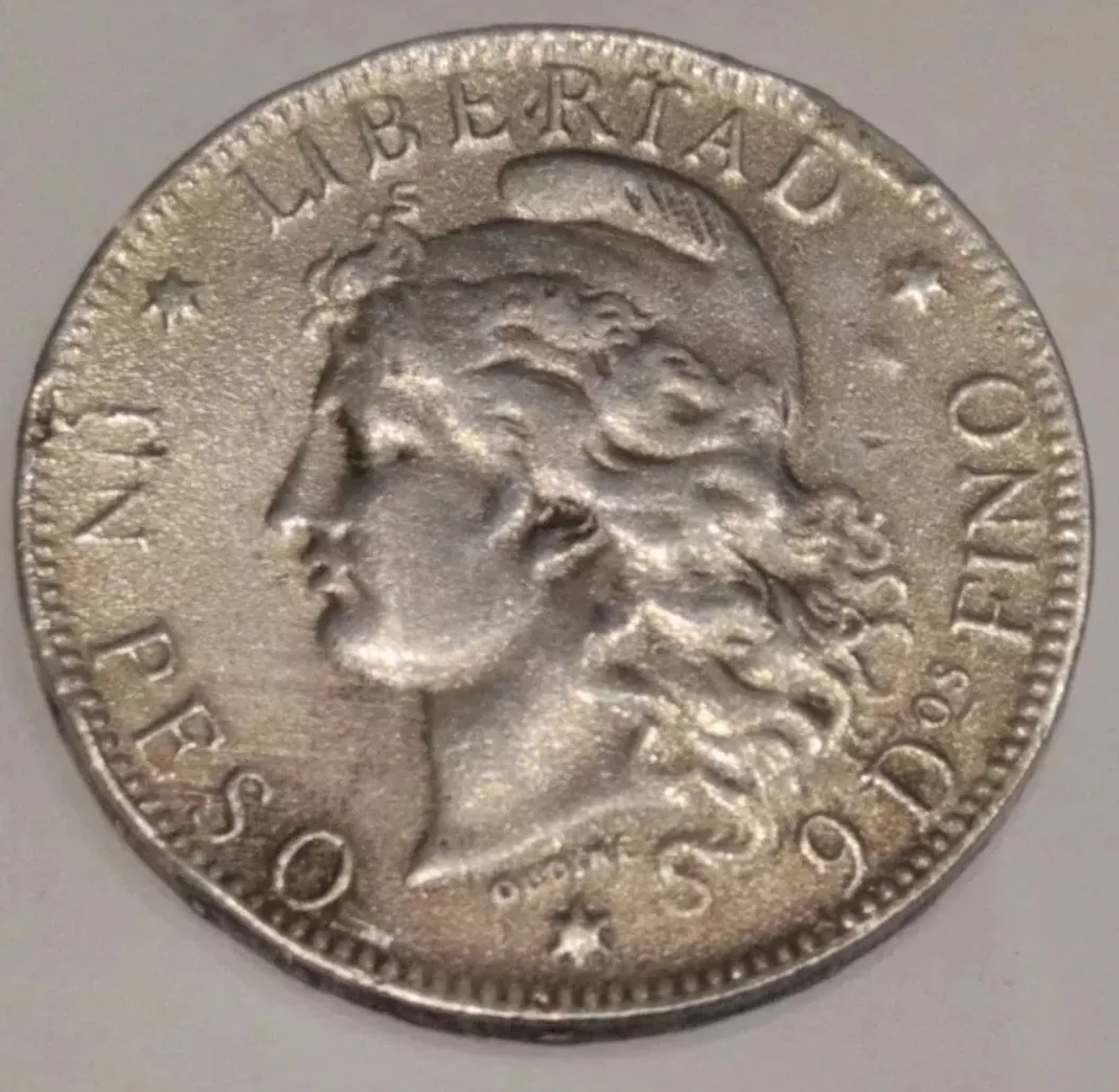 El anverso de la moneda presenta brazos abanderados dentro de una corona, con un medio sol radiante encima, el año de emisión, y la leyenda “República Argentina”. En el reverso, se puede observar la figura de la Libertad mirando hacia la izquierda, acompañada de las palabras “Libertad”, “Un peso” y “9 dos Fino”. El canto de la moneda lleva grabadas las palabras “Igualdad ante la Ley”, lo que añade un valor histórico y simbólico a esta pieza única.