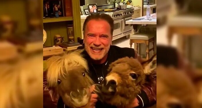 Pero el gran Terminator deleitó a sus fans al llevar a su burro Lulu y a su pony miniatura Whiskey al trabajo. Estos simpáticos animalitos son los que lo mantienen ocupado en su día a día.