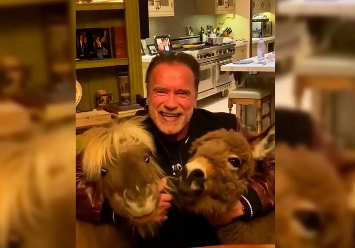 Pero el gran Terminator deleitó a sus fans al llevar a su burro Lulu y a su pony miniatura Whiskey al trabajo. Estos simpáticos animalitos son los que lo mantienen ocupado en su día a día.
