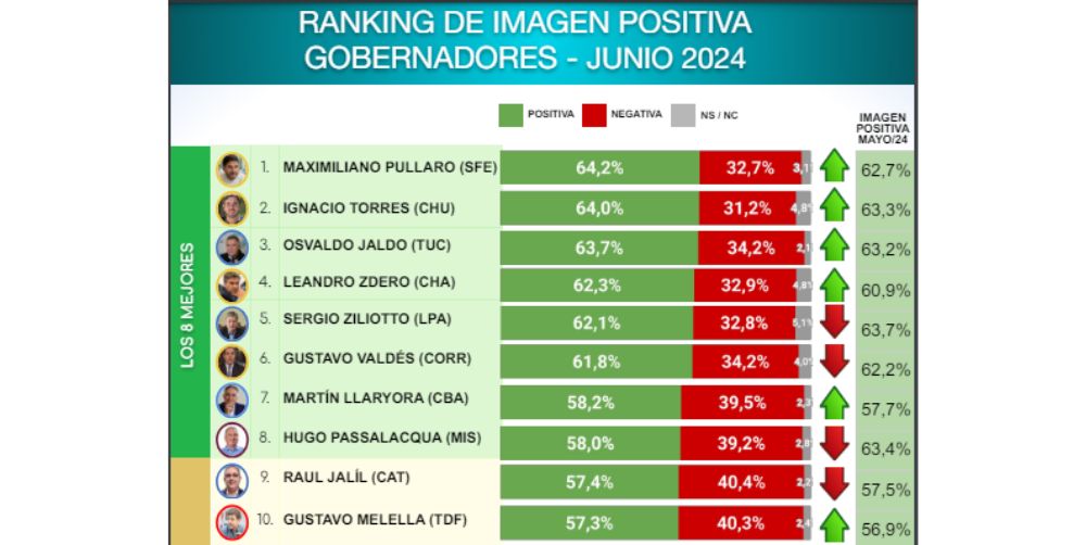 - Maximiliano Pullaro de Santa Fe, con un 64.2% de imagen positiva, lidera el ranking.