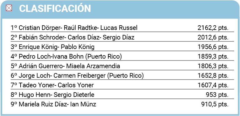 Los ganadores presentaron una planilla con doce especies y completaron nueve cupos. Y les alcanzó para superar a Fabián Schroder, Carlos Díaz y Sergio Díaz, un trío que viene pescando muy bien este año, a tal punto que se quedaron con las dos primeras fechas del Interno de Puerto Rico.
