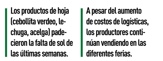 “Todo lo que es hoja, necesita sol para su crecimiento; estos días de lluvia y humedad afectó bastante a la producción de todo lo que es lechuga y no había; había faltante de acelga, perejil, la cebollita no crecía, entonces todo eso afecta al productor y eso se ve después en los fines de semana, cuando en la feria hay faltante de esos productos”, agregó Villasanti.