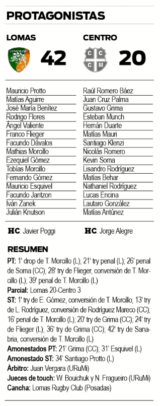 Pero Lomas, pese al adelantamiento de Centro, nunca dejó de ser efectivo y al tempranero try del “Pocho” Gómez le sumó más tarde un penal de Tobías Morcillo, un nuevo try de Flieger (a los 24) y sobre el final un gran try del juvenil Juan Cruz Sanabria (ingresó como medio scrum), quien tras una pelota bajada del line en mitad de cancha, encontró los espacios y con cambio de paso y gran velocidad terminó en el ingoal azulgrana para cerrar el partido.