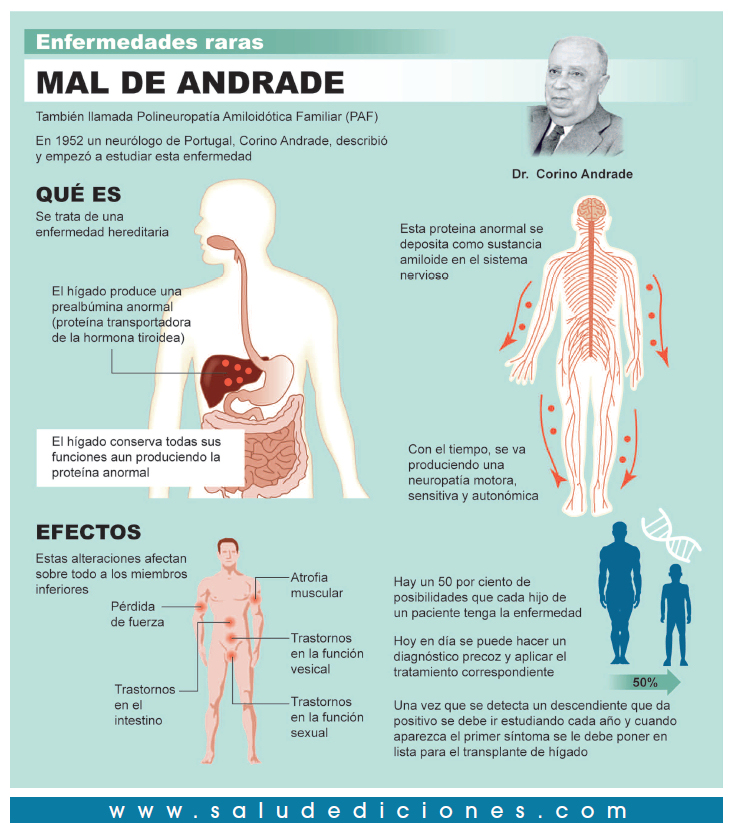 El 10 de junio se celebra el Día Mundial de la Enfermedad de Andrade, una enfermedad rara hereditaria también conocida como Polineuropatía Amiloidótica Familiar (PAF) que afecta el sistema nervioso periférico, especialmente a las células nerviosas y a los nervios que se conectan a los órganos, generando una neuropatía sensitiva, autonómica y motora progresiva. Con esta efeméride, coincidente con la fecha de nacimiento del neurólogo Corino Andrade, quien descubrió esta patología, se pretende visibilizar la importancia de conseguir un diagnóstico precoz para las personas que padecen esta enfermedad.