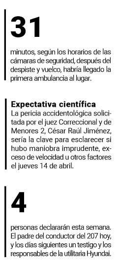 En cuanto a los dos menores que sobrevivieron y que viajaban como acompañantes, se concretaron sus relatos de lo sucedido ante la Justicia, pero reiteraron que no recordaban el instante preciso de la colisión trágica. El expediente se instruye como “homicidio culposo en accidente de tránsito agravado”. Perdieron la vida Luca Ceballos y Juan Cruz Martínez tras sufrir traumatismos y fracturas múltiples, las principales fueron en el cráneo.