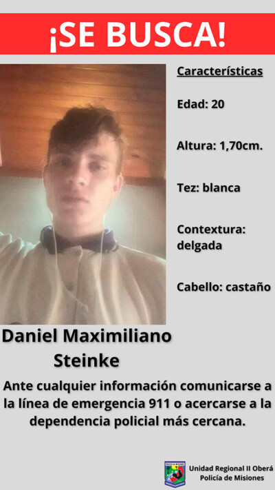 Daniel Maximiliano Steinke tiene 20 años y el último lunes, alrededor de las 18.30, salió de su casa ubicada en el Barrio 10 Viviendas sin regresar hasta el momento.