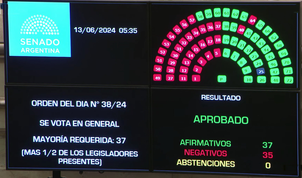 Esta madrugada, la votación en general de la iniciativa obtuvo 37 adhesiones y 35 rechazos. Luego se continuó con el tratamiento en particular del proyecto (se dio por títulos, salvo algunos artículos), en un debate que comandó el titular provisional del Senado, Bartolomé Abdala, ya que Victoria Villarruel se encontraba en ese momento ya a cargo del Poder Ejecutivo por el viaje de Javier Milei a Europa.