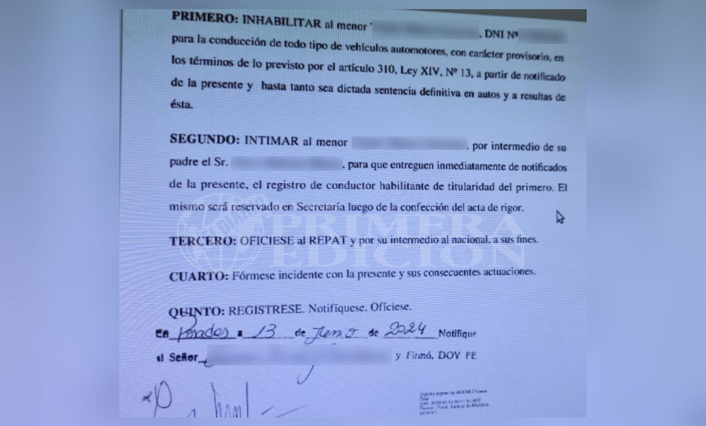La medida tuvo respuestas de la justicia misionera recién este miércoles “hasta tanto sea dictada sentencia definitiva”, por lo que el padre del menor imputado estuvo de acuerdo con lo solicitado, firmando la resolución judicial y entregando la licencia de conducir de su hijo.