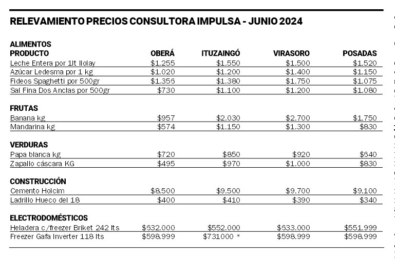 Ese porcentaje hizo que el Ministerio de Hacienda difundiera ayer un relevamiento de 12 productos de diferentes rubros (desde alimentos de la canasta básica hasta materiales de construcción y electrodomésticos más demandados por las familias). El mismo estuvo a cargo de la consultora Impulsa y se compararon precios con Ituzaingó y Virasoro (en Corrientes) con Posadas y Oberá.