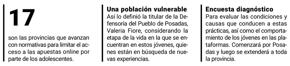 A nivel nacional, son alrededor de 17 las provincias que avanzan con normativas para limitar el acceso a las apuestas online por el crecimiento de la ludopatía entre los adolescentes. A pesar de no tener un proyecto de ley nacional, diferentes jurisdicciones proponen limitar la publicidad sobre estas plataformas en redes sociales y la posibilidad de que menores interactúen en estos sitios.