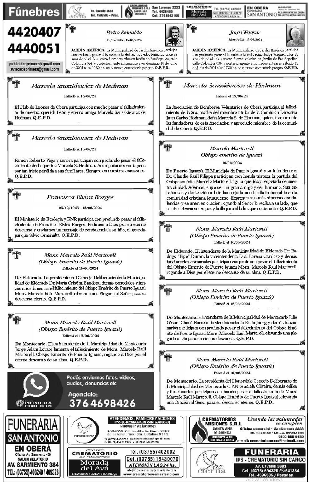 • Fúnebres del Sábado 15 de Junio de 2024