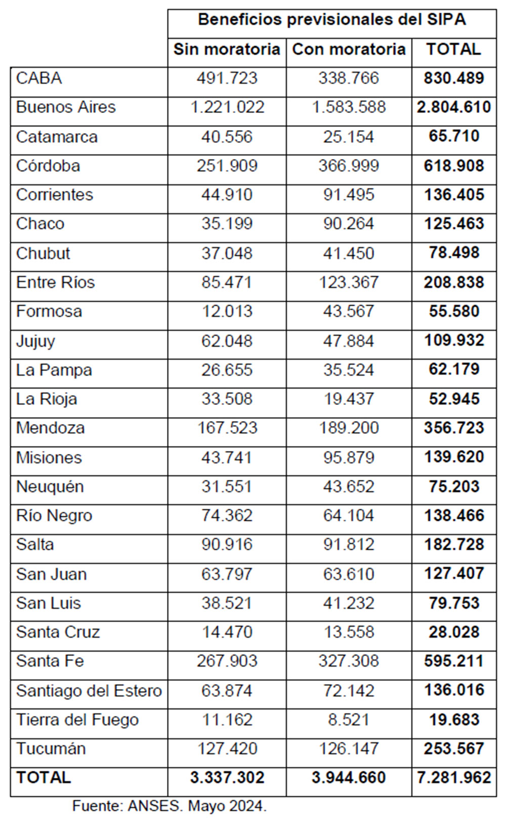 CABA tiene más aportantes que beneficiarios de moratoria. En esa ciudad hay 491.723 jubilados sin moratoria y 338.766 con el beneficio, totalizando 830.489 pasivos. Buenos Aires posee 2.804.610 jubilados, de los cuales 1.221.022 no tienen moratoria y 1.583.588 sí.