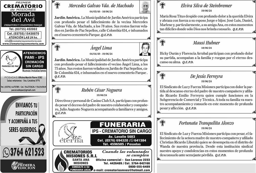 • Fúnebres del Miércoles 19 de Junio de 2024