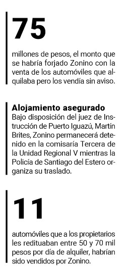 Según la gentileza de informes del diario El Liberal de Santiago del Estero, entre 50.000 y 70.000 pesos por día pagaba Zonino a los dueños por alquiler de cada vehículo. Pero en pleno apogeo del negocio, nunca más les devolvió los coches y mucho menos les acercó más dinero.