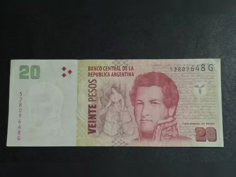 Este billete, que presenta la imagen del prócer Juan Manuel de Rosas, tiene un detalle especial en su parte trasera: la tinta ha traspasado el papel, revelando la palabra “pesos” en el reverso.