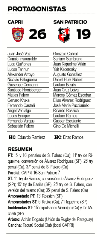 Luego de cuatro derrotas consecutivas, una de local ante Aguará y tres de visitante frente a Taragüy, Aranduroga y CURNE, CAPRI volvió a cantar victoria en el Súper 10 del Regional del Nordeste, al vencer ayer en cancha de Tacurú a San Patricio de Corrientes por 26 a 19, en el marco de la novena fecha del certamen.