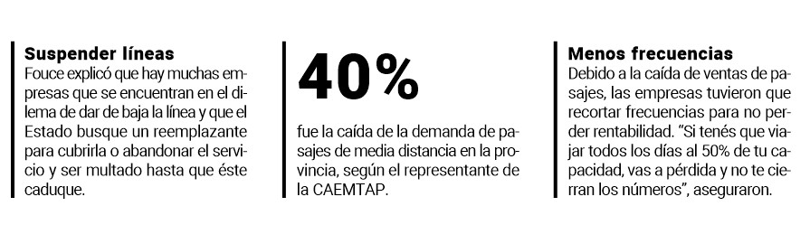 En los casos de ya no poder realizar los recorridos en algunas líneas, Fouce explicó que a los empresarios les quedan dos opciones: dar de bajas las líneas, para que el Estado busque otra empresa que lo haga o abandonar el servicio y que la Subsecretaría de Transporte lo multe hasta que le den la caducidad del servicio.