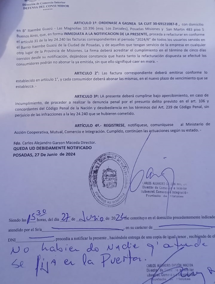 Ahora, a través de un comunicado, ratificó que “en virtud del aumento importante que se pudo apreciar, se ha dispuesto desde la Dirección de Comercio Interior, dependiente del Ministerio de Acción Cooperativa, en aplicación de lo establecido en la Ley de Defensa del Consumidor, la inmediata refacturación de todos los usuarios de conformidad al artículo 31 en un plazo de cinco días corridos. Por lo tanto, hasta que la empresa no efectúe dicha refacturación, los usuarios pueden no abonar la factura correspondiente al periodo 2024/6″.
