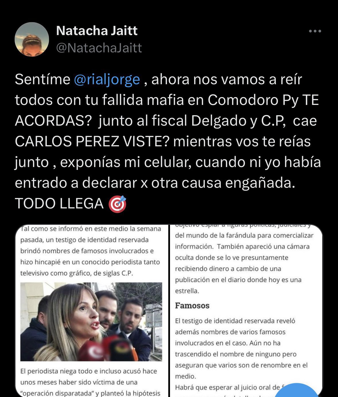 “Escuchame Jorge Rial, ahora nos vamos a reír todos con tu fallida mafia en Comodoro Py, ¿te acordás? Junto al fiscal Delgado y C.P. cae Carlos Pérez, ¿viste? Mientras vos te reías y exponías mi celular cuando yo ni había entrado a declarar por una causa engañada. Todo llega“, escribió Natacha en su cuenta de Twitter en aquel entonces.