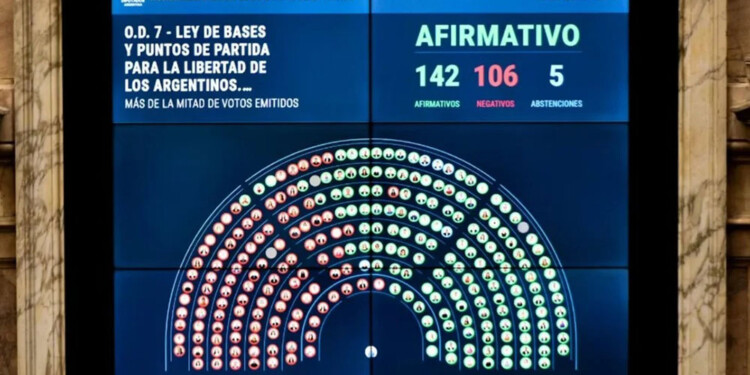 La Ley Bases 147 votos positivos, 107 negativos y dos abstenciones. Apoyaron la iniciativa La Libertad Avanza, el PRO, la UCR, el grueso de Hacemos Coalición Federal, Innovación Federal, la mayor parte de la Coalición Cívica y otras fuerzas minoritarias.