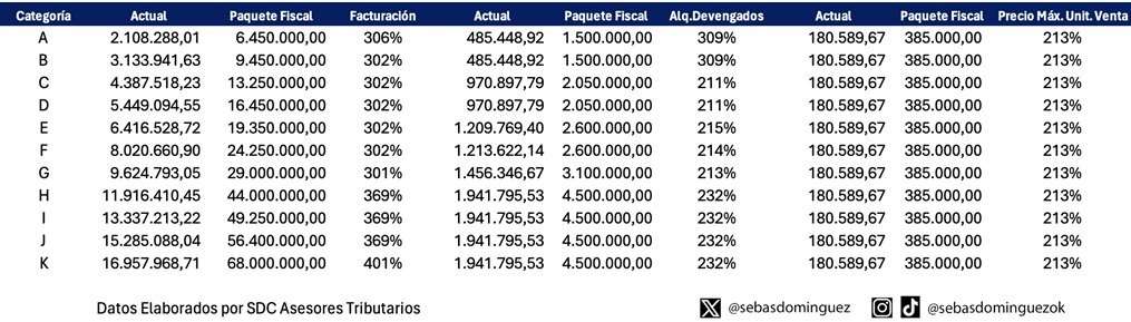 Entre dichas modificaciones se puede mencionar la suba de los montos de facturación de entre un 301% y un 401%, además de un alza en las cuotas, entre otros puntos los cuales fueron desglosados en seis claves por Sebastián Domínguez, CEO de SDC Asesores Tributarios, y publicado por El Cronista.