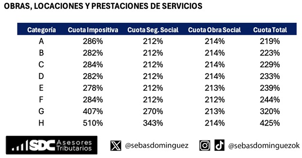 • Aumentan las cuotas impositivas, de seguridad social y obra social: en línea con la suba de los parámetros para cada categoría, se ajustarán también las cuotas impositivas (entre un 278% y 510% más), la cuota de seguridad social (suba de entre un 212% y un 343%) y la cuota de obra social (entre un 212% y un 214% más) para el caso de obras locaciones y prestaciones de servicios. Así, la cuota total para quienes abonen los tres componentes será de entre un 219% y un 425%, mientras que en el caso de venta de bienes (cosas muebles), la cuota total si se pagan todos los puntos subirá entre un 219% y un 353%.