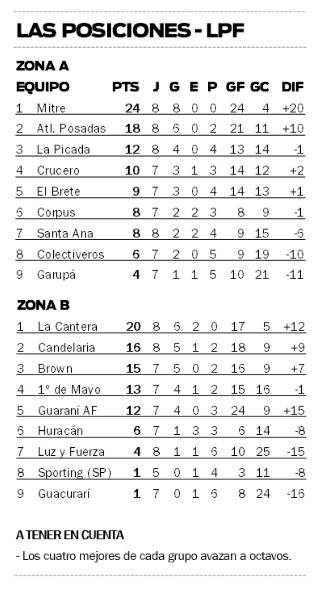 Si bien quedan muchos partidos para poner al día el certamen, ya tienen su lugar asegurado en cuartos Mitre y Atlético Posadas, por la Zona A; y solo La Cantera, por la Zona B.