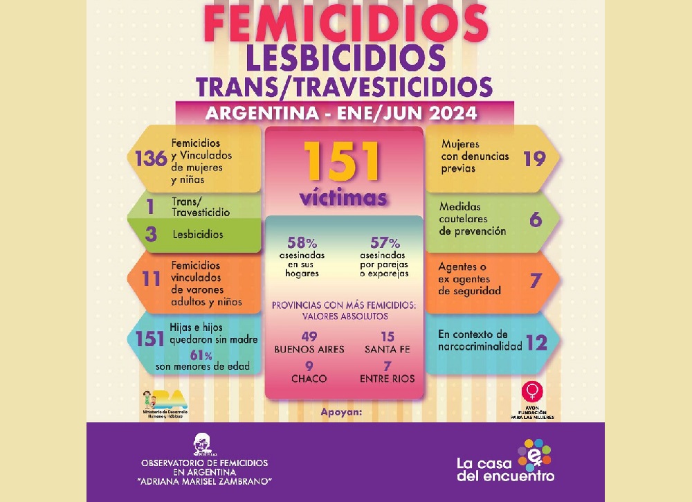 En la Argentina, desde el 1 de enero al 30 de junio de este año, se produjeron 136 femicidios y femicidios vinculados de mujeres y niñas, 3 lesbicidios, 1 trans-travesticidio y 11 femicidios vinculados de varones adultos y niños, según un nuevo informe del Observatorio de Femicidios en Argentina “Adriana Marisel Zambrano” que dirige La Casa del Encuentro.