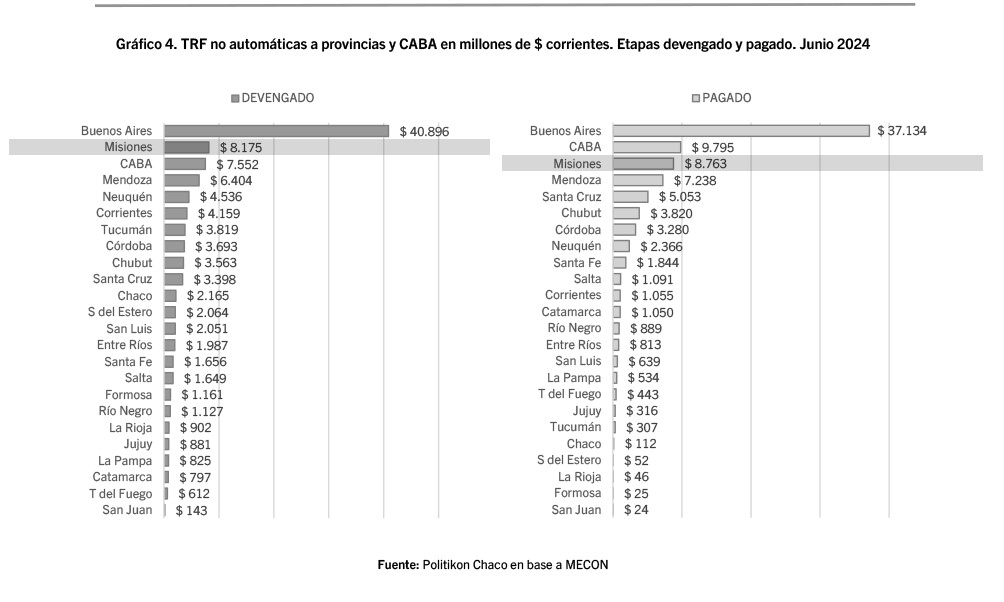 “La provincia de Buenos Aires concentró el mayor volumen de envíos no automáticos, tanto en su etapa devengado (39,2% del global) como en la etapa pagado (42,8%). El podio también para ambas instancias se completa con CABA y Misiones aunque en diferentes posiciones: Misiones quedó segunda en las devengadas (7,8%) y CABA tercera (7,2%): en las pagadas, CABA segunda (11,3%) y Misiones tercera (10,1%)”, precisó la consultora que sigue mes a mes la evolución de la relación financiera entre el Estado nacional y las provincias.