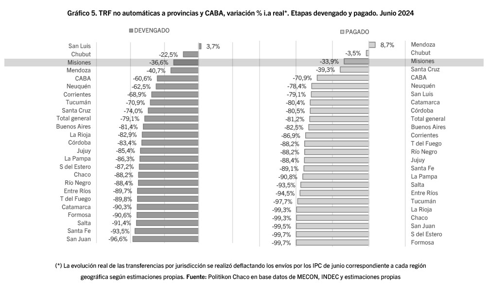 Respecto a lo que ocurre en el total de las provincias y la CABA, la consultora Politikon indicó que “en junio de 2024 las transferencias no automáticas del Estado nacional en etapa devengadas a las 24 jurisdicciones subnacionales del país totalizaron $104.216 millones registrando una variación del -22,1% nominal interanual; al descontar la inflación proyectada del mes, estos envíos exhiben una baja real del 79,1% interanual”.