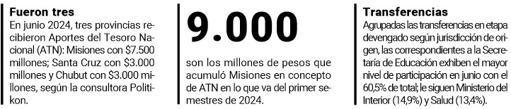 En cuanto a Misiones puntualmente, Politikon reveló que en junio se giraron $8.763 millones, que se distribuyeron en los siguientes conceptos:
