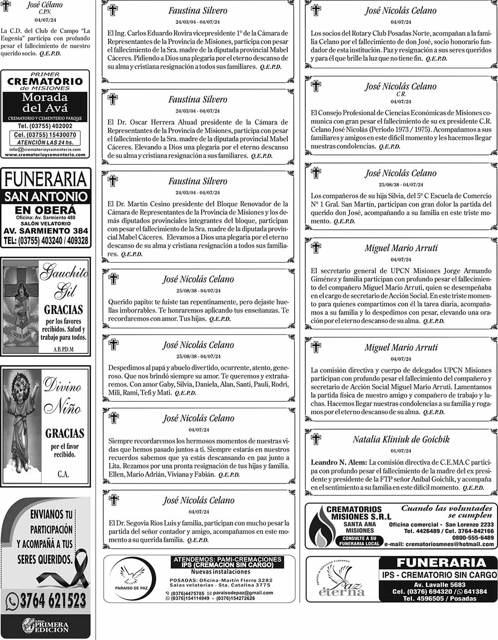 • Fúnebres del Miércoles 3 de Julio de 2024