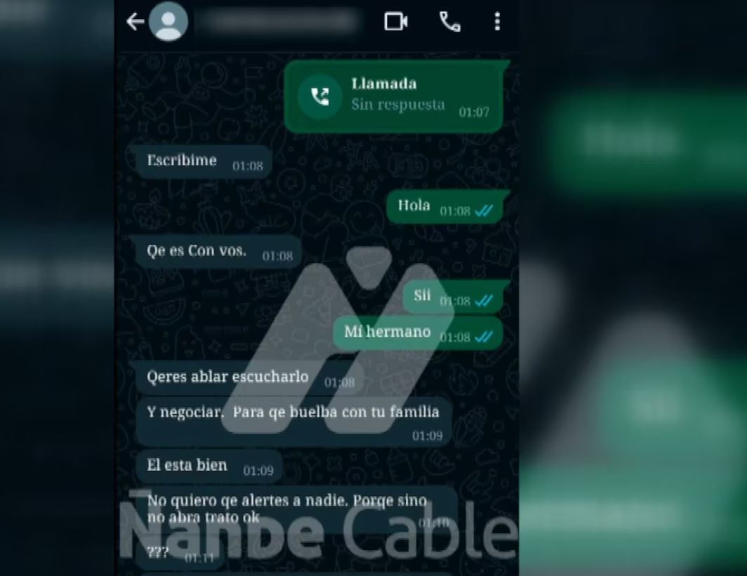 El mensaje continúa de manera amenazante: “Él está bien. No quiero que alertes a nadie porque sino no habrá trato ¿ok?”.