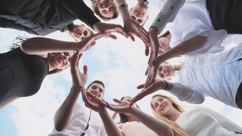 A group of high school students look through the shape of a circle created from their palms. The concept of friendly friends