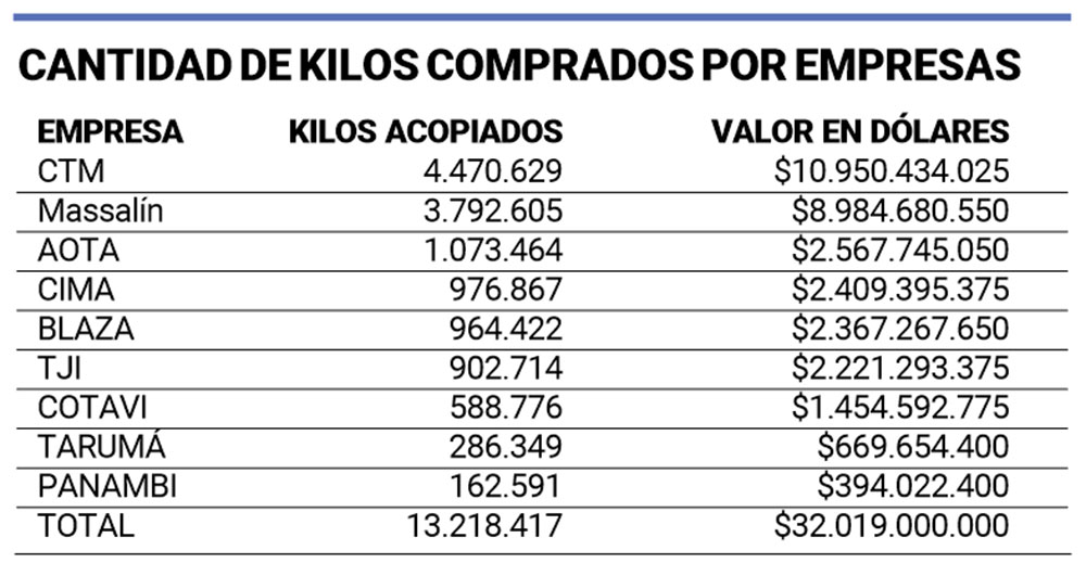 Las contingencias y eventos climáticos adversos bajaron esas estimaciones a 22 millones, quedando poco más de diez millones de diferencia con lo finalmente acopiado. “Finalmente (el acopio) ha caído un poco, quedó la estimación en unos 22 millones y se terminó acopiando unos 13 millones de kilos. Con relación al año anterior, en el 2023 se acopió 18 millones de kilos”, dijo.