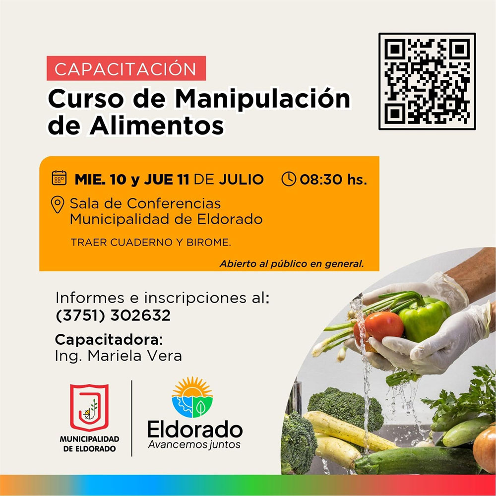 Con el objetivo de capacitar en prácticas que garanticen la seguridad e higiene de los alimentos que se consumen, la Dirección de Recursos Humanos de la Municipalidad de Eldorado, con el apoyo de la Dirección de Bromatología Veterinaria y Zoonosis, anuncia la realización de un nuevo curso de Manipulación de Alimentos el miércoles 10 y jueves 11 de julio, a partir de las 8.30 horas, en la sala de conferencias del edificio municipal.
