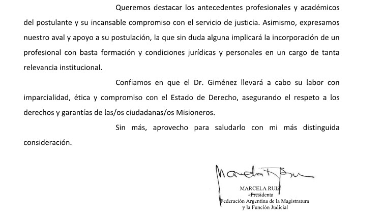 Finalizó el texto, expresando: “Confiamos en que el Dr. Giménez llevará a cabo su labor con imparcialidad, ética y compromiso con el Estado de Derecho, asegurando el respeto a los derechos y garantías de las/os ciudadanas/os misioneros”.