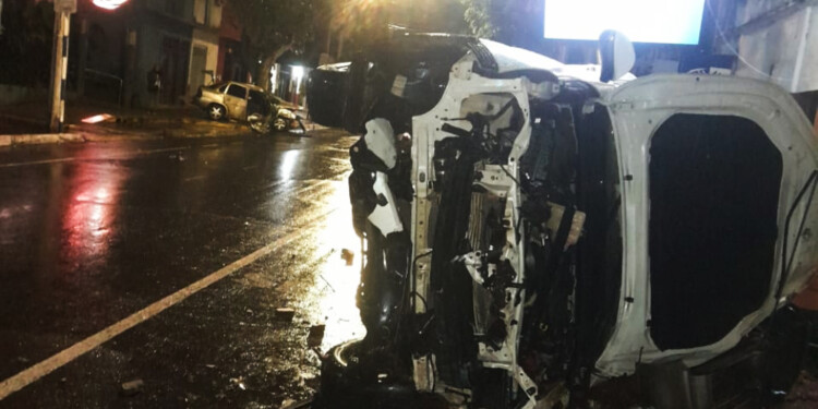 A raíz del impacto, el vehículo de menor porte fue desplazado varios metros hasta quedar sobre la vereda de un instituto médico ubicado en calle Bolívar. En tanto la 4×4 quedó volcada sobre su costado derecho sobre la vereda opuesta.