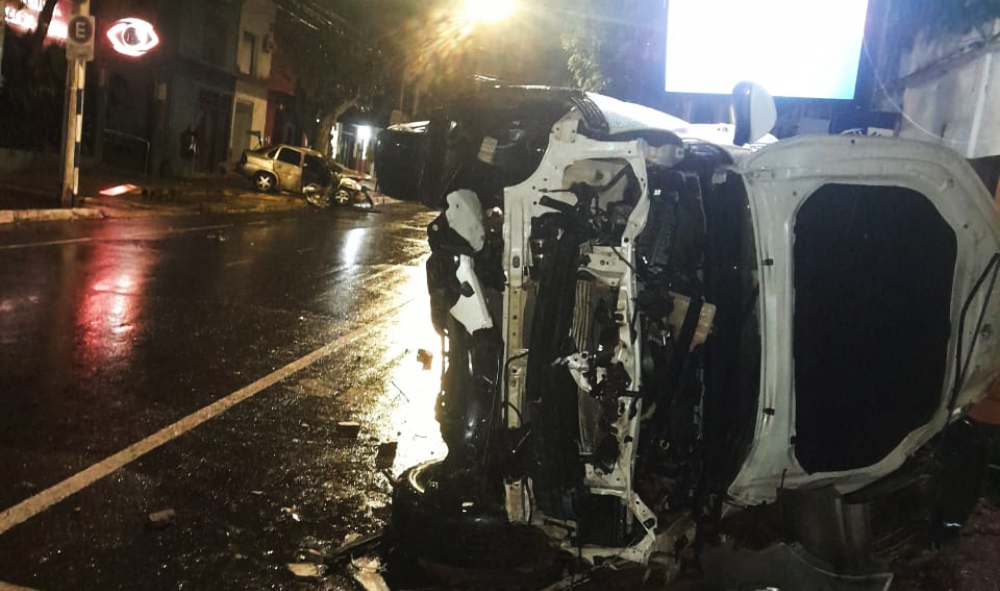 A raíz del impacto, el vehículo de menor porte fue desplazado varios metros hasta quedar sobre la vereda de un instituto médico ubicado en calle Bolívar. En tanto la 4×4 quedó volcada sobre su costado derecho sobre la vereda opuesta.