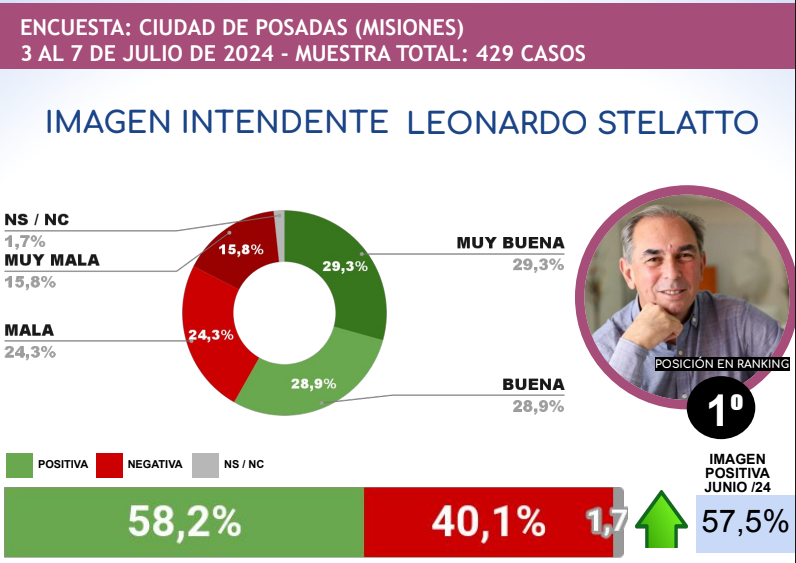 En ese marco, el ranking de intendentes con mejor valoración del mes de julio es encabezado por el jefe comunal posadeño, Leonardo Stelatto, quien cumple su segundo mandato. Según la encuesta, “Lalo” tiene una imagen positiva del 58,2% a nivel país.