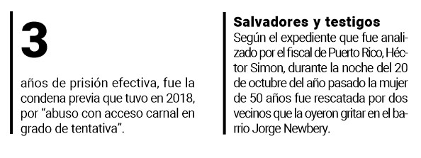Para Simon está acreditada la acción del acusado contra la víctima de 50 años, cuando regresaba de su trabajo y caminaba por la calle Jorge Newbery de Puerto Rico. Minutos después de las 20, el sospechoso se acercó a ella desde atrás y la tomó del brazo arrastrándola hacia una zona de malezas en inmediaciones de la calle Plumerillo.