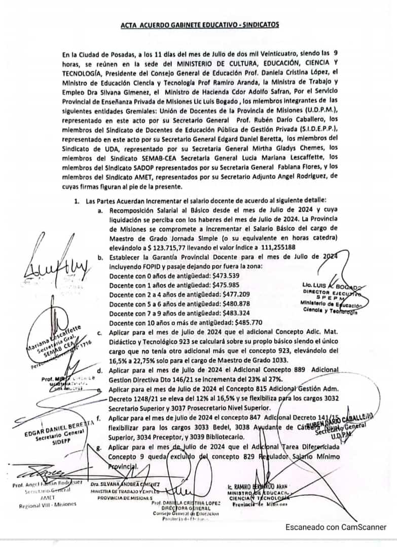 El acta contempla un incremento al básico, llevando el mismo de $113.500,77 a $123.715,77, recomposición al mínimo provincial, que en el caso del docente que recién se inicia en un cargo o su equivalente en horas cátedras será de $473.539, e introduce correcciones y mejoras a algunos conceptos como por ejemplo el 923.