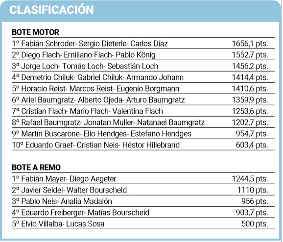 En la pesca de la boga los mejores fueron Diego Carballo, Diego Rivas y Héctor Bouix, que finalizaron la jornada con cuatro capturas y 29,7 puntos. Fueron escoltados por Martín Buscarone, Elio Hendges y Estéfano Hendges, con dos ejemplares y 14,7 puntos. El tercer escalón del podio fue para Ariel Baumgratz, Alberto Ojeda y Arturo Baumgratz, con una pieza y 6,4 puntos.
