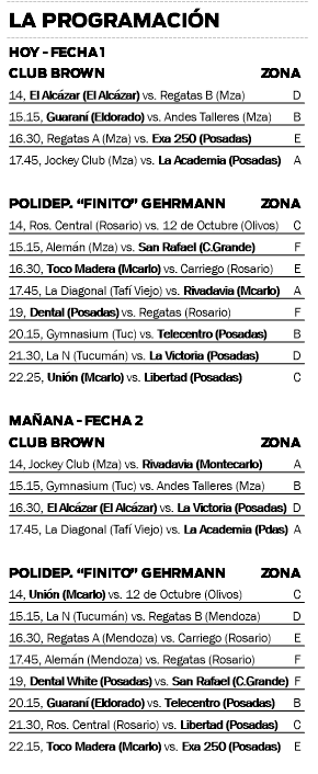 El telón se abrirá hoy desde las 14 en simultáneo, tanto en el Brown como en el “Finito” Gehrmann. El primer misionero en debutar será El Alcázar, que chocará en la primera de esas canchas ante Regatas B de Mendoza. En ese mismo lugar y desde las 15.15, Guaraní de Eldorado se presentará ante otro mendocino, Andes Talleres; mientras que a las 16.30 jugarán Exa 250 frente a Regatas A de Mendoza. El cierre allí será a las 17.45 con Jockey Club de Mendoza ante los posadeños de La Academia.
