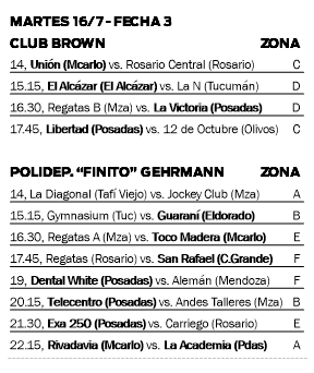 En cuanto al “Finito”, para los locales la acción comenzará a las 15.15 con el debut de San Rafael de Campo Grande frente a Alemán de Mendoza. Luego, Toco Madera se medirá con Regatas de Rosario, Rivadavia hará lo propio ante La Diagonal de Tafí Viejo (Tucumán), Dental enfrentará a Regatas de Rosario, Telecentro se medirá con Gymnasium de Tucumán, La Victoria lo hará ante la N, también de Tucumán; mientras que Unión de Montecarlo y Libertad de Posadas cerrarán el día. La entrada para cada jornada valdrá mil pesos.