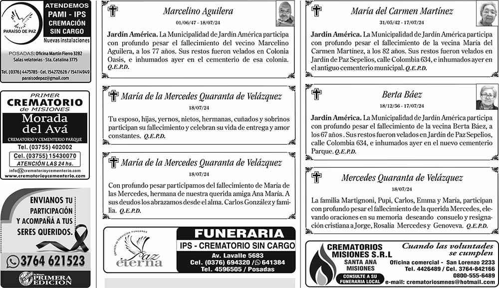 • Fúnebres del Miércoles 17 de Julio de 2024