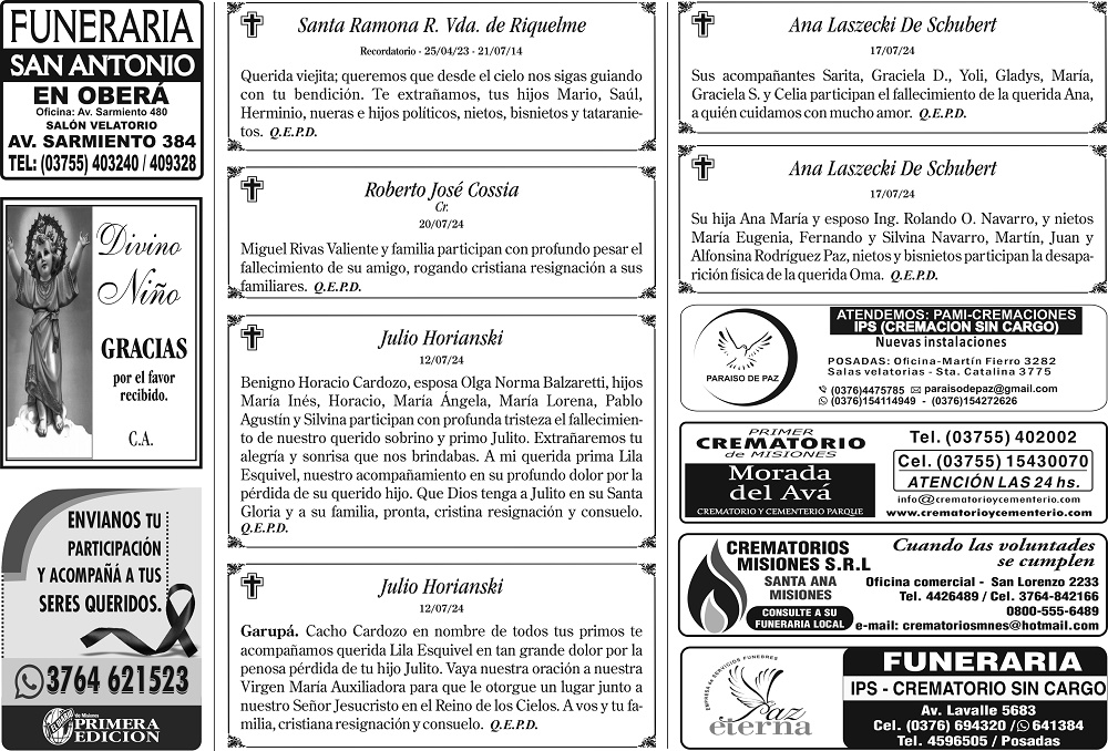 • Fúnebres del Miércoles 17 de Julio de 2024