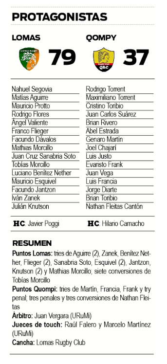 Por el lado de Qompi, los encargados de llegar al ingoal rival fueron Genaro Martín, Luis Francia y Evaristo Frank, además de contar con un try penal a su favor. Por su parte, el fullback Nathan Fleitas Canton aportó tres penales y tres conversiones, redondeando así los 37 puntos de la visita.