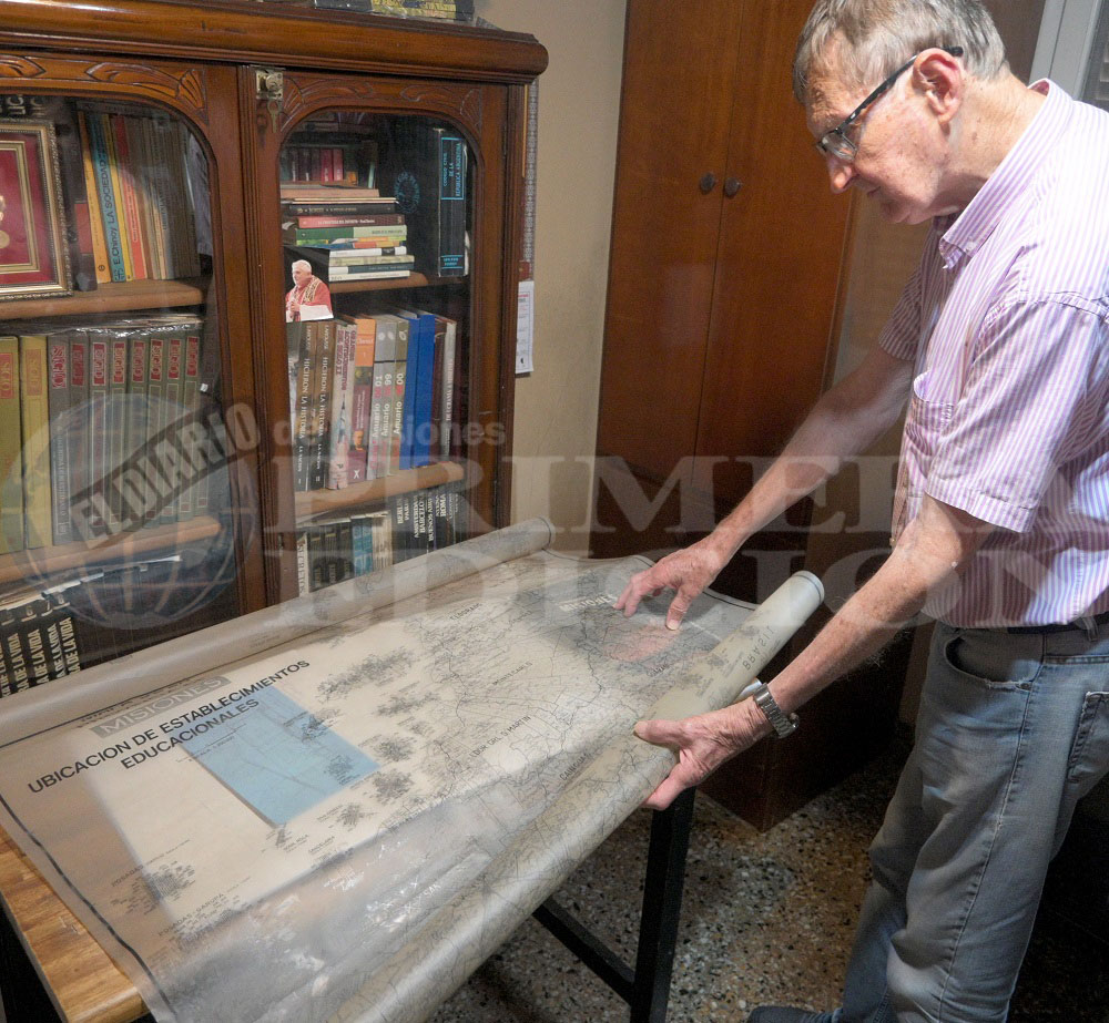 Fueron 16 años los que pasó en Tierras y Bosques, “porque también teníamos que atender los problemas de bosques, los litigios que había entre la tierra fiscal y la privada por la explotación de pinos en San Pedro, la famosa Línea Barilari de 1964/Decreto 1173 mediante el que había que respetar una faja de cuatro kilómetros y los madereros miraban para otro lado. Con estas cosas, uno iba viendo y aprendiendo. Dejé agrimensura. Me gustaba, dibujaba, conseguía los atlas, me copiaba con Kowalski que era un viajero, políglota, que llegó cuando yo tenía 6 años y lo veía pintar sus primeros bocetos. Eso me quedó muy grabado. Siempre teníamos contacto, cruzaba la calle y charlábamos, porque era un hombre muy abierto y dado a la pintura, a las artes. Él me despertó mucho interés de viajar, conocer lugares, andar, lo que tuve la oportunidad de hacer en la provincia que la recorrí de cabo a rabo”.