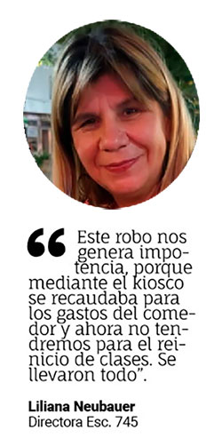 La directora del establecimiento, Liliana Neubauer, explicó a PRIMERA EDICIÓN que el ingreso de las personas que cometieron el hecho, “fue por el cielorraso hasta el sector del kiosco escolar y del SUM. Las cosas que se llevaron del kiosco son muy importantes porque permiten el funcionamiento del mismo porque de allí se generan los fondos para los gastos que a diario tenemos en la institución, principalmente para el comedor”.